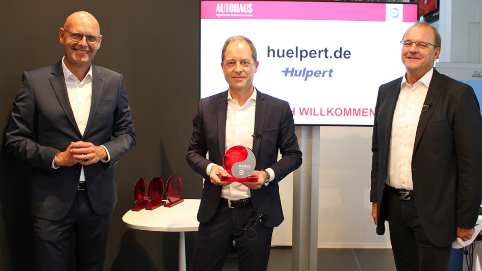 von 15: 4. Platz: Hülpert Mobility Holding - Axel Bischopink (Chief Operating Officer TÜV SÜD Division Mobility), Andreas Krämer (Geschäftsführer Hülpert) und Ralph M. Meunzel (Chefredakteur AUTOHAUS; v.l.n.r.)