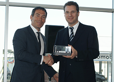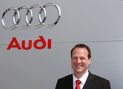 von 6: Achim Saurer, Gesamtvertriebsleiter Audi Süd-West, überreichte dem geschäftsführenden Gesellschafter Steffen Hahn ein Miniatur-Modell des Audi-Terminals.