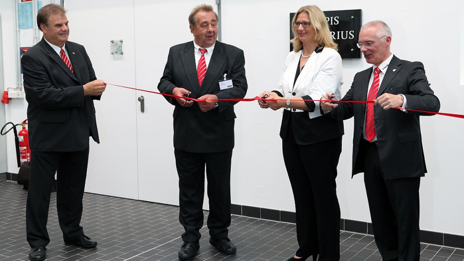 von 10: Der feierliche Augenblick (v.r.): Peter Schuler, Ministerin Anke Rehlinger, KÜS-Präsident Peter Zaremba und Hans-Georg Marmit, Chef der Unternehmenskommunikation, zerschneiden das rote Band zum Zeichen des offiziellen Starts des neuen Prüfzentrums.