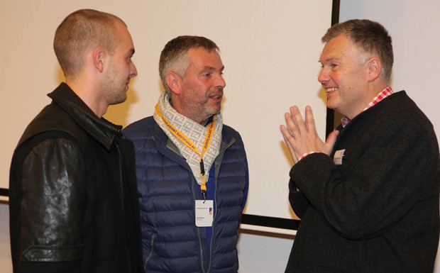 von 3: Ein engerer Dialog als auf der Deutschland-Tour geht kaum: Eurogarant-Vorstands-Chef Thorsten Fiedler (r.) im Gespräch mit dem Münchner K&L Unternehmer Rainer Karmel (mi.) und dessen Sohn Michael.