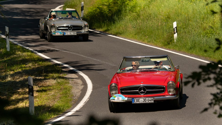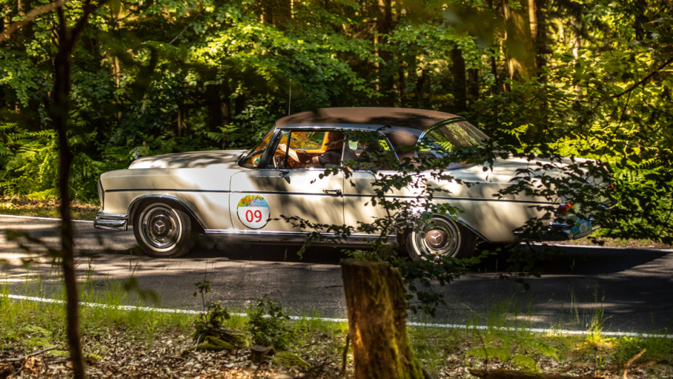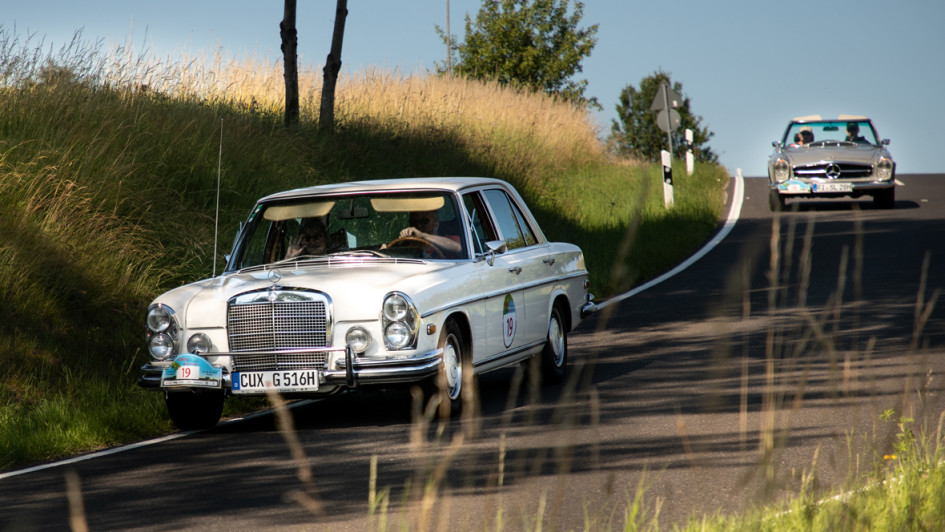 von 14: Vorne das Team 19: Petra und Guido Küver, Autohaus Küver, in einem Mercedes-Benz 280 SE. Gefolgt von Team 18: Heinz Niederdorf, Autohaus Niederdorf, und Henry Wilke, Autohaus Wilke.
