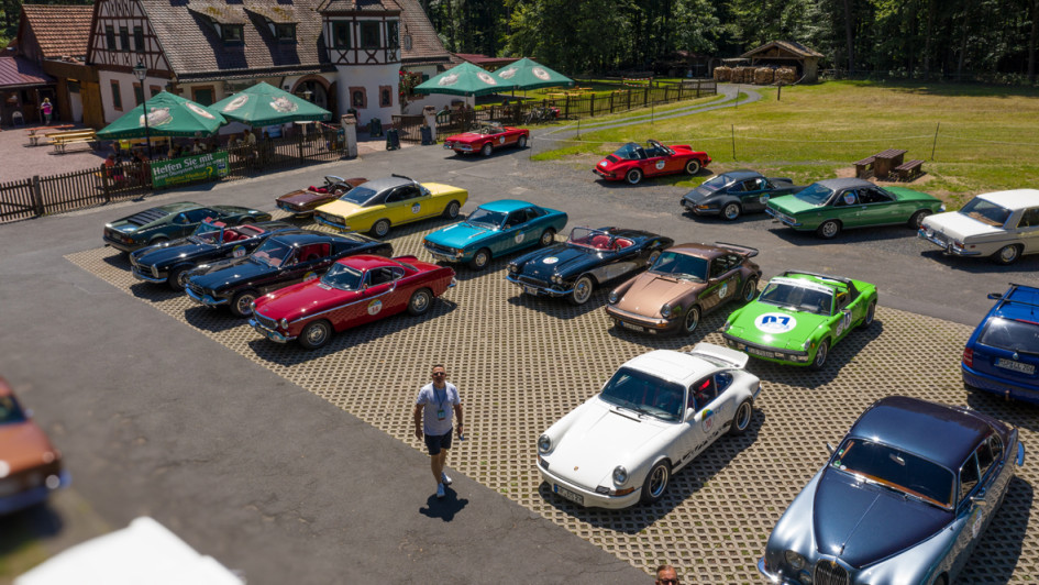 von 14: Bei der 13. AUTOHAUS Santander Classic-Rallye standen in diesem Jahr vom Tourhotel Kempinski in Gravenbruch aus Spessart und Odenwald auf dem Programm. Im Bild: Team 22 (v.), Werner Tönnemann und Uwe Mack, im Opel Commodore A GS/E Coupé. Im Hintergrund Team 20: Linda und Clemens Betzemeier in einer Corvette C1.