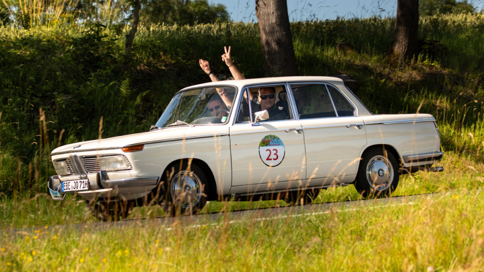 von 14: Sichtlich Spaß an der Rallye hatten Fahrer Jascha Bräuer und Beifahrer Maik Kynast, Santander Consumer Bank, in einem BMW 1800 (Neue Klasse).