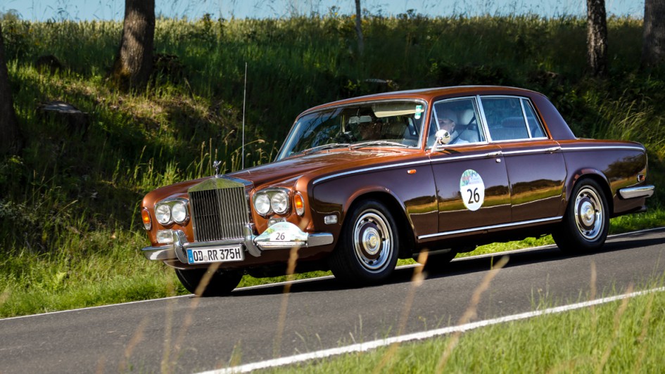 von 14: Die erste Etappe am Freitag war 240 Kilometer lang und führte die Teilnehmer durch Hessen und Bayern. Petra und Dieter Lehmann, APW Lehmann Automobile, in einem Rolls-Royce Silver Shadow.