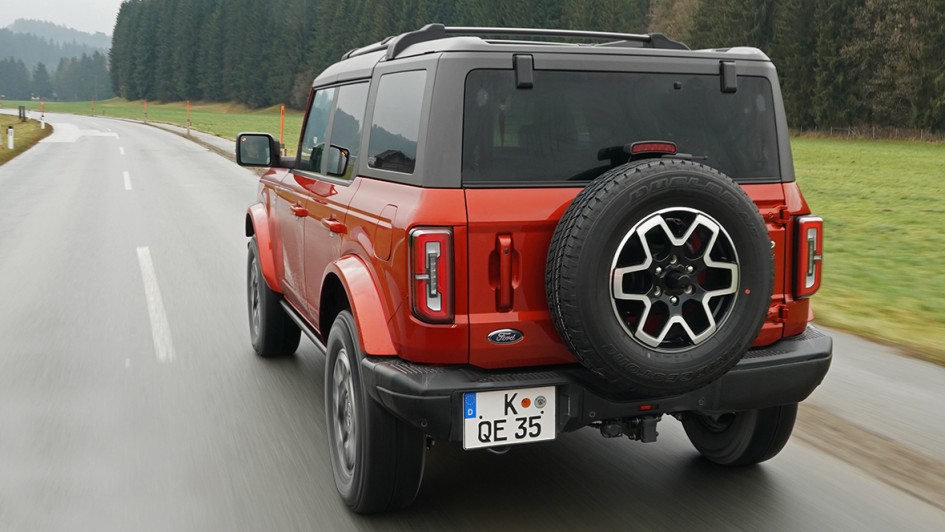 von 7: Der Bronco trabt auch vom Stand Weg souverän los. Lediglich bei Nässe kommen die am Testwagen (Ausstattung Badlands) montierten, groben AT-Reifen schnell an die Haftungsgrenzen und das ESP hat Arbeitseinsatz.