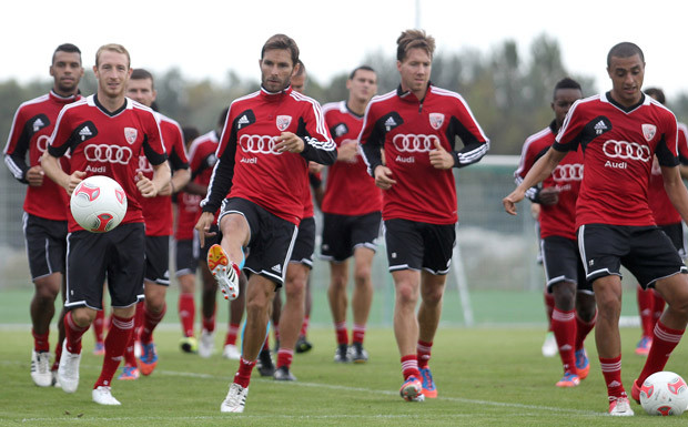 von 8: In der 2. Fußball-Bundesliga sind bei drei Teams Automobilhersteller bzw. Importeure als Trikotsponsor aktiv. Wie in der 1. Liga spielt die regionale Nähe häufig eine Rolle: Beim FC Ingolstadt 04 wird Audi getragen. Hier Moritz Hartmann, Stefan Leitl, Fabian Gerber, Ahmed Akaichi und die Mannschaftskollegen beim Trainingslauf. (Foto: Stefan Bösl)