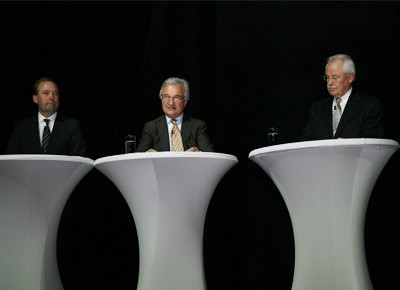 von 31: Haben den Vertrag gut verhandelt, v. li.: Philip Pfohe, Präsident des europäischen Ford-Händlerverbandes, Volker Reichstein und Justitiar Joachim Pfeffer