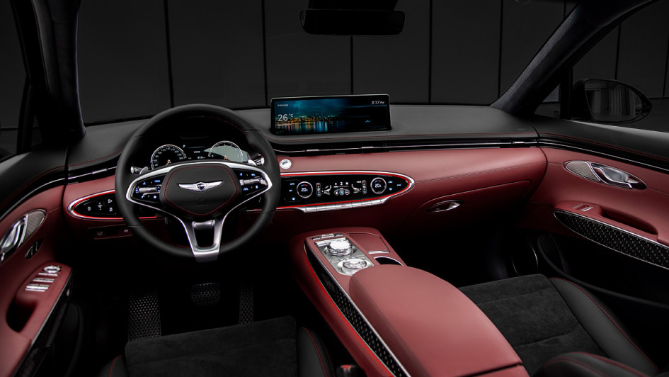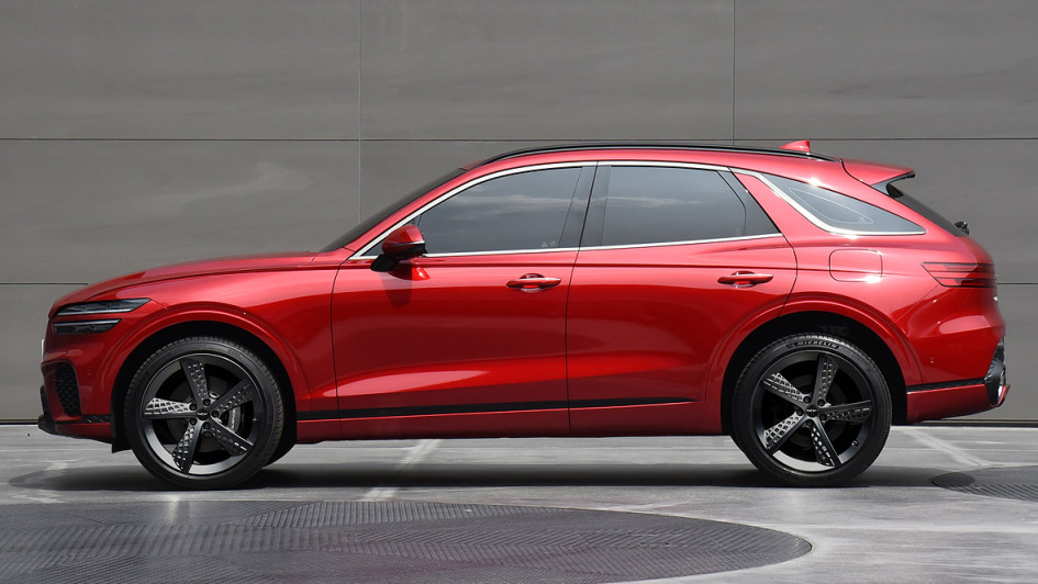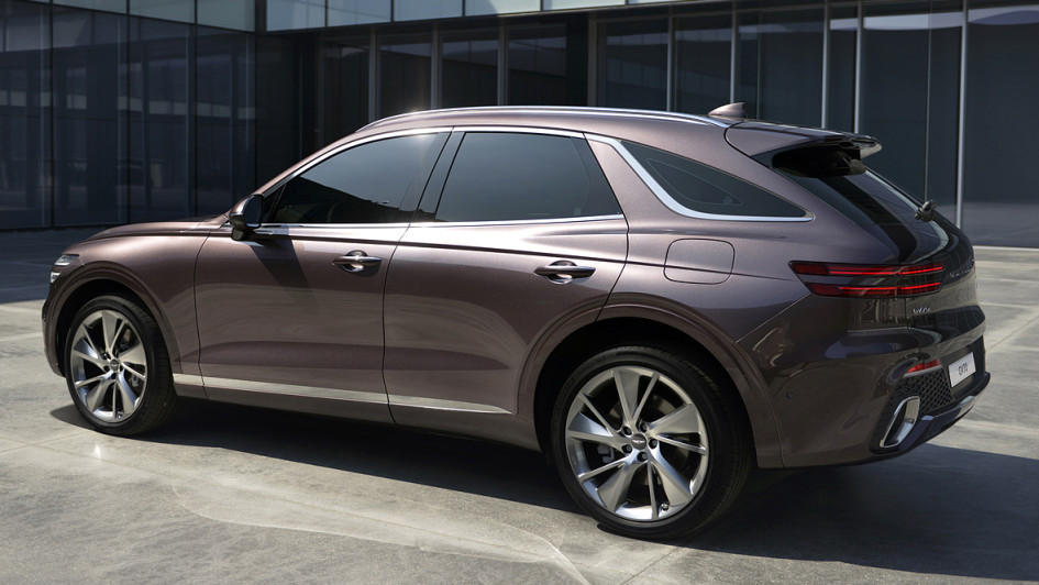 von 4: Der GV70 ist sportlich-elegant gezeichnet, unter anderem verfügt das Modell über einen coupéhaften Dachverlauf und eine rundliche Heckpartie.