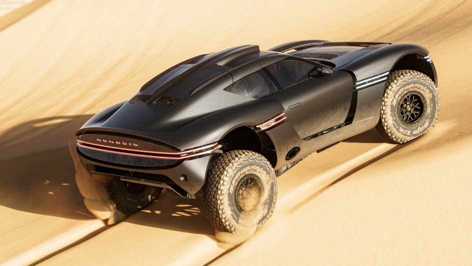 von 3: Der coupéartige Zweitürer kombiniert eine lange Front mit kurzem, abrupt abfallender Heckpartie. Statt flach auf Asphalt zu kauern, kommt der Sportwagen dank großer Offroad-Räder und reichlich Federweg sehr hochbeinig daher.