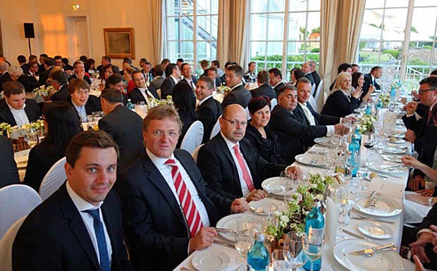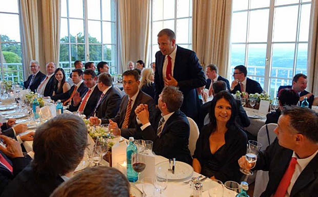 von 24: Das Agape! Ein 3-Gang-Menue! Jörn Everhard, Leiter Vertrieb Santander, beim "liquiden" Anstoßen mit seinen Handelspartnern.
