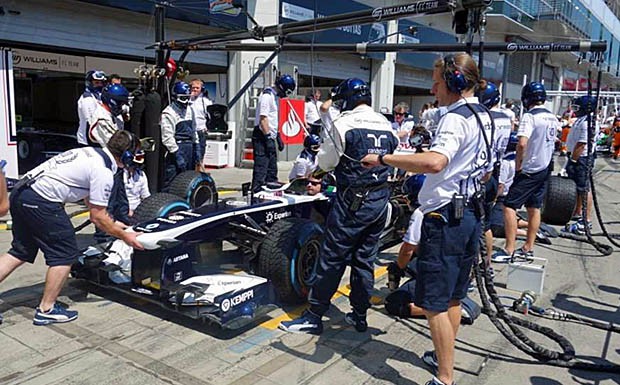 von 24: Tausend Mal geübt und doch hat sich der Reifen von Mark Webber (Red Bull Racing) nach der falschen Montage gelöst und springt durch die Boxengasse. Dabei wurde ein Kameramann verletzt.