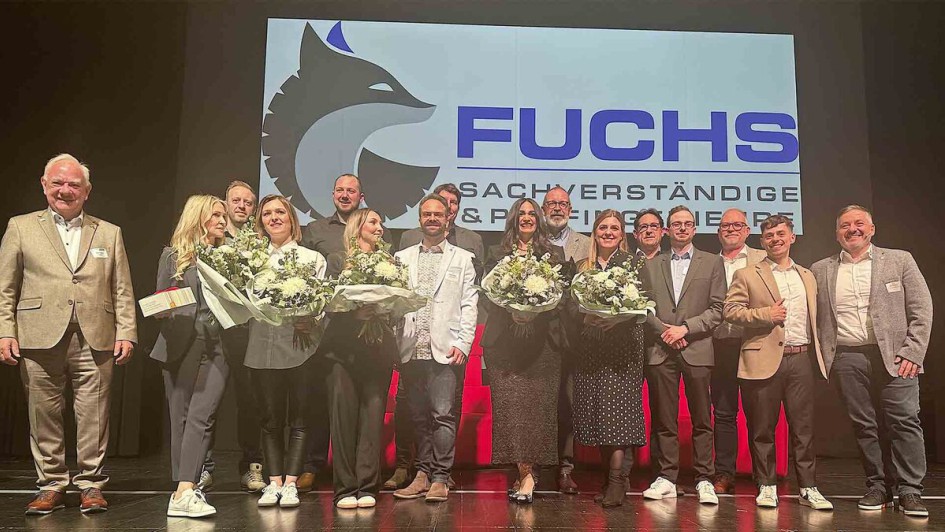 von 26: DEVK-Chefsachverständiger Nino Bey (2.v.r.) mit seinen beiden Kollegen Daniel Grass (2.v.l.) und Daniel Dietrich (r.) sowie Marcel Reinert (SV-GmbH Reinert).