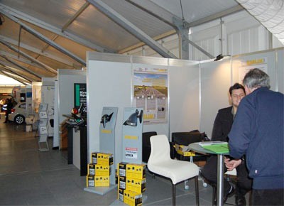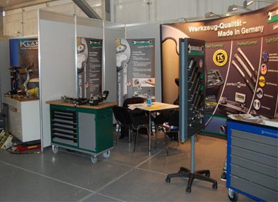 von 17: Jörg Helfmann mit Gottfried Scholz und seiner Standmannschaft. Die neue Cover-Halle löst den Händlern die Platzprobleme rund um die Räderlagerung.