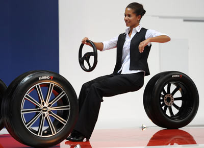 von 19: Zauberei? Eine Messehostesse am Stand von Kumho Tyres auf einem imaginären Sitz (Foto: Torsten Silz/dapd)