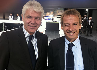 von 19: Hyundai-Markenbotschafter Jürgen Klinsmann (r.) mit Deutschland-Chef Werner Frey auf der IAA. (Foto: Ralph M. Meunzel/AUTOHAUS)
