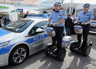 von 19: Freund und Helfer: Zwei Politzisten auf ihren Segways vor einem Opel Ampera (Foto: Torsten Silz/dapd)
