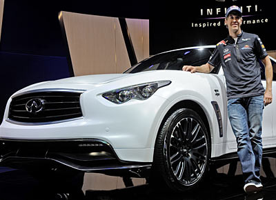 von 19: Der amtierende Formel-1-Weltmeister Sebastian Vettel am Stand des japanischen Autoherstellers Infiniti. (Foto: Thomas Lohnes/dapd)