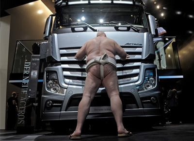 von 19: Mann gegen Truck: Ein Sumoringer versucht sich an einem Mercedes-Benz "Actros" (Thomas Lohnes/dapd)