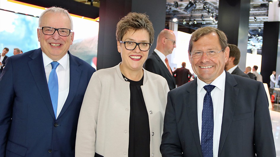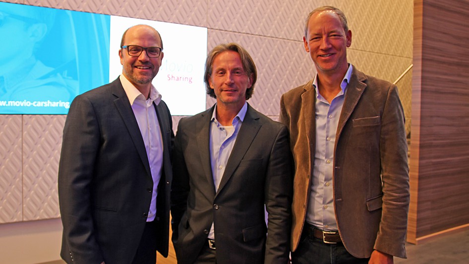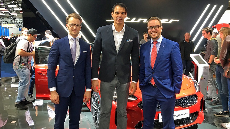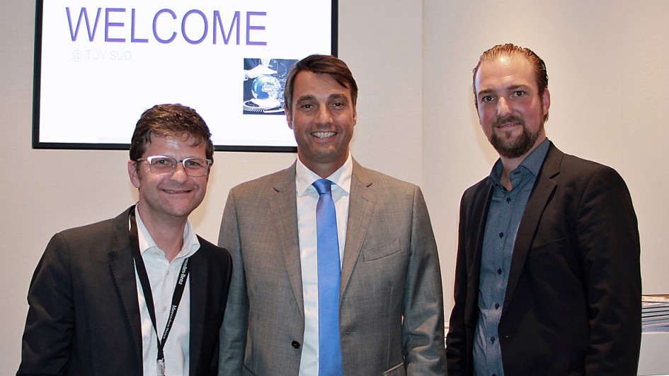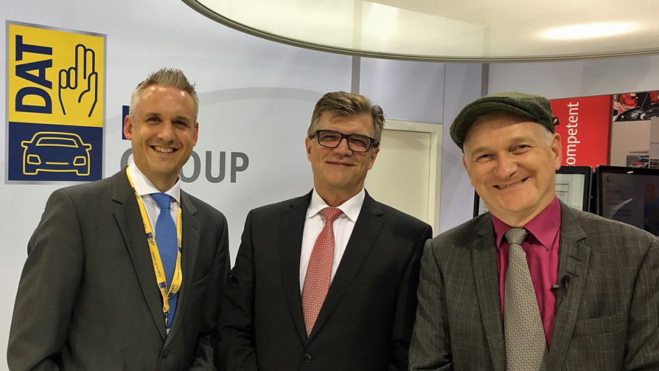 von 18: Dietmar Winkler (l.), Chefredakteur asp, und Patrick Neumann (r.), stellvertretender Chefredakteur AUTOHAUS, mit Patrick Fruth vom TÜV Süd