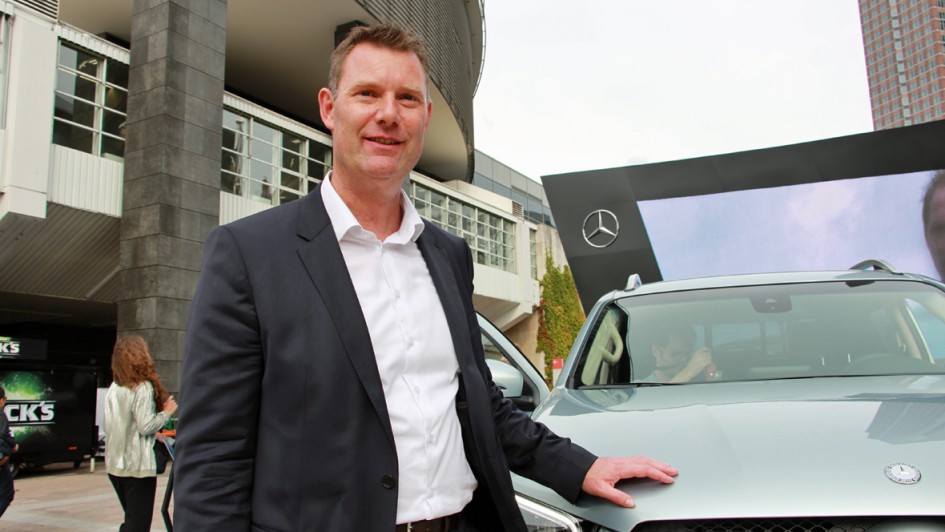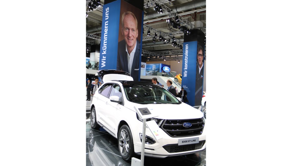 von 18: Ford-Deutschlandchef Wolfgang Kopplin war allzeit präsent auf dem Messestand seiner Marke. Mit dem Slogan "Wir kümmern uns" grüßte er von einem Pfeiler.