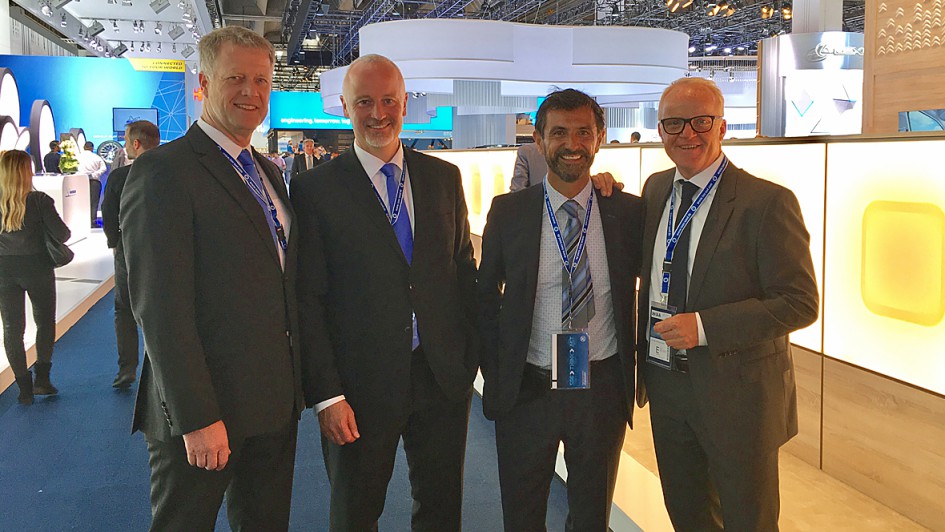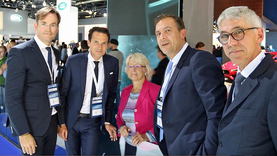 von 18: Der BMW-Händlerverbandsvorstand, v.l.: Dirk Horn, Präsident Peter Reisacher, Cyril von Recum und Georg Hakvoort mit AUTOHAUS-Redakteurin Doris Plate.