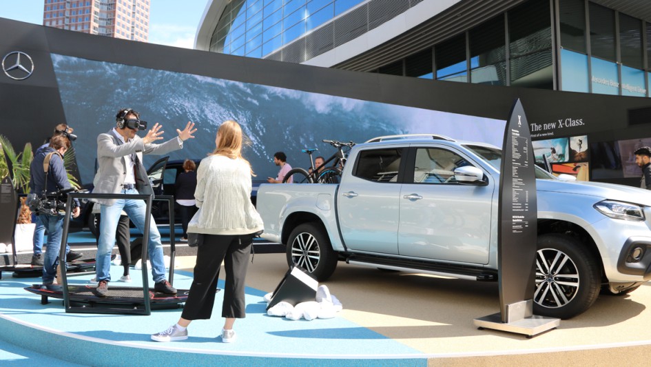 von 18: Eindrucksvolle Präsentation einer Virtual Reality-Brille auf dem Außengelände bei Mercedes-Benz. Im Hintergrund die neue X-Klasse der Marke.