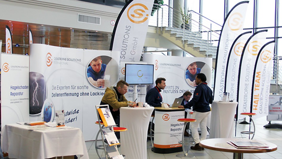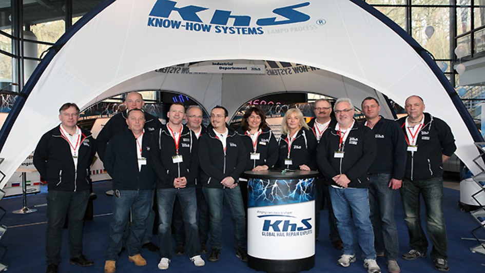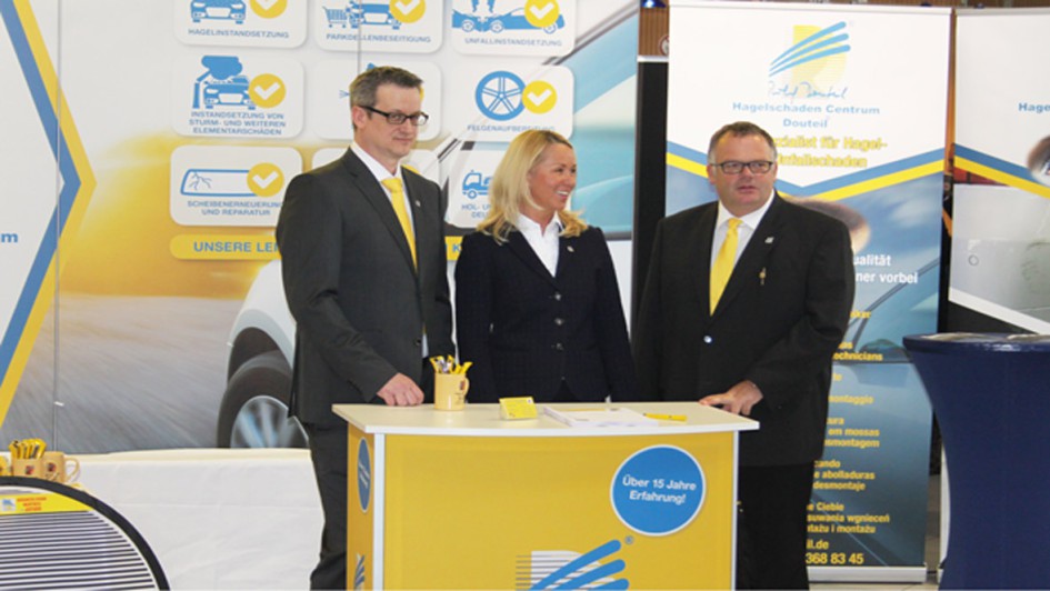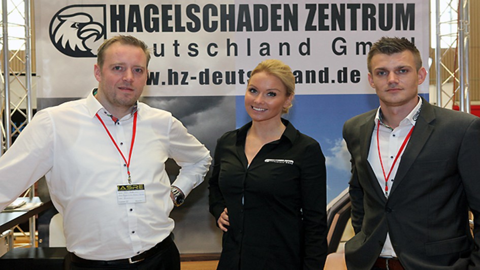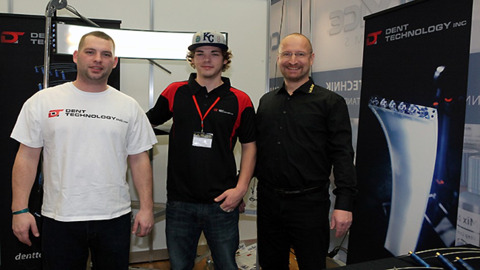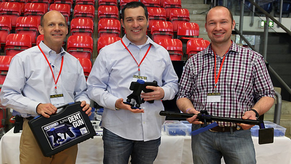 von 44: Tim Fischer, Chris White u. Mr. Jonathan von KECO Tabs aus den USA führten ihre Dent Gun, eine speziell entwickelte „Pistole“ zum Dellenziehen mittels Klebe-Pads vor.