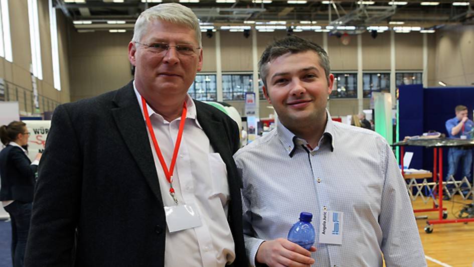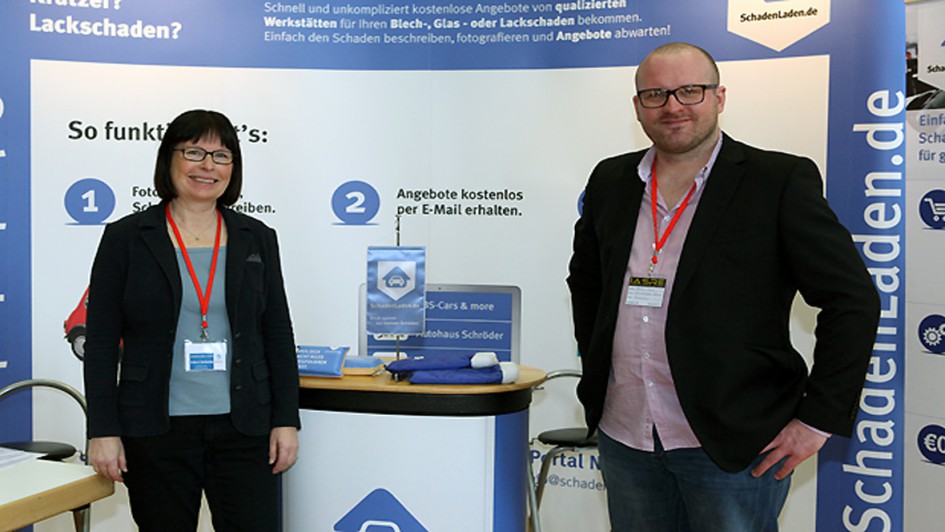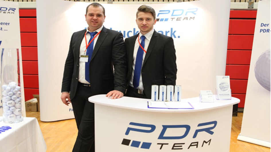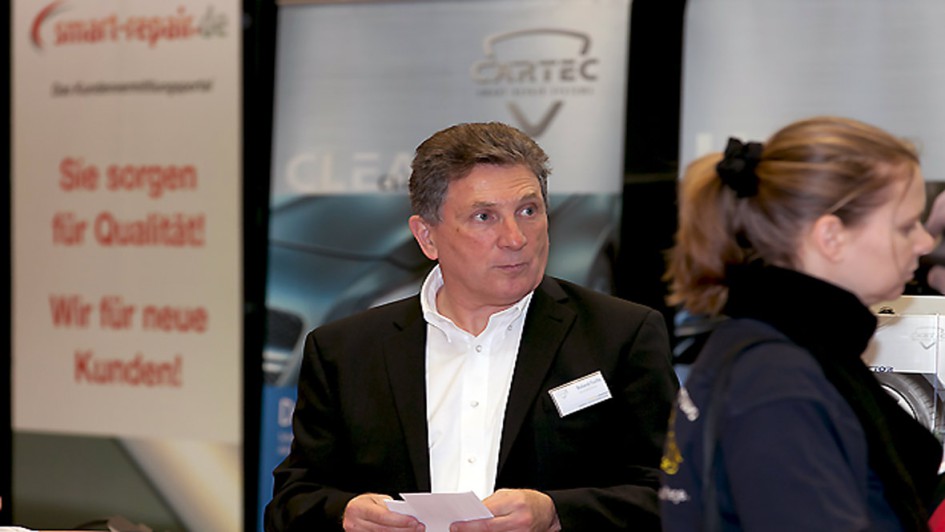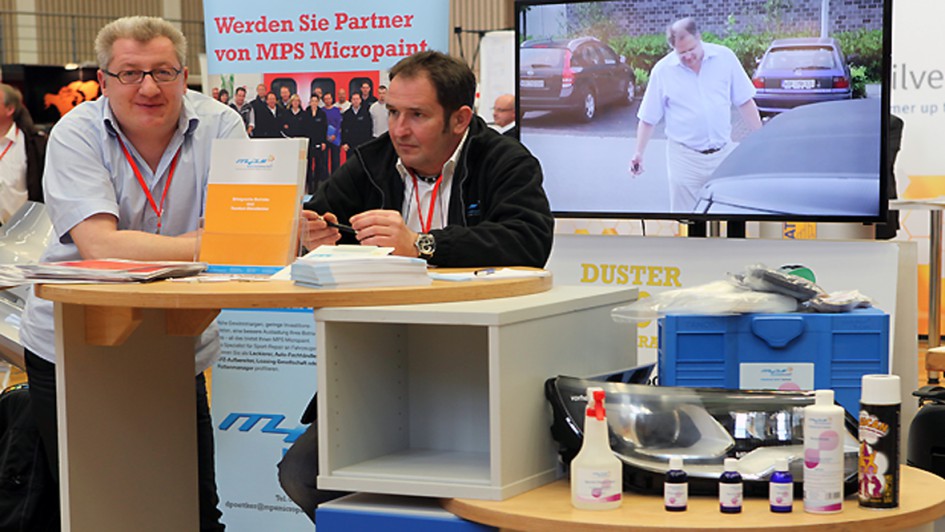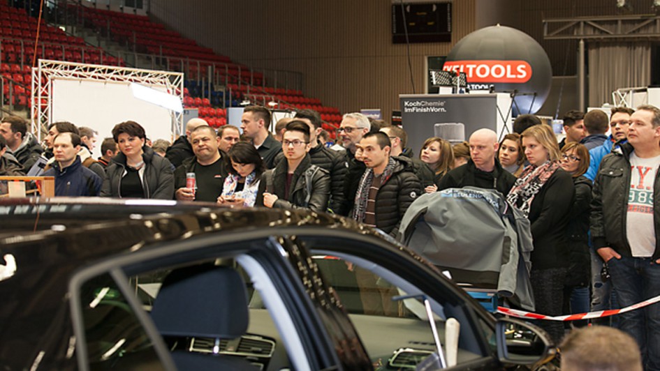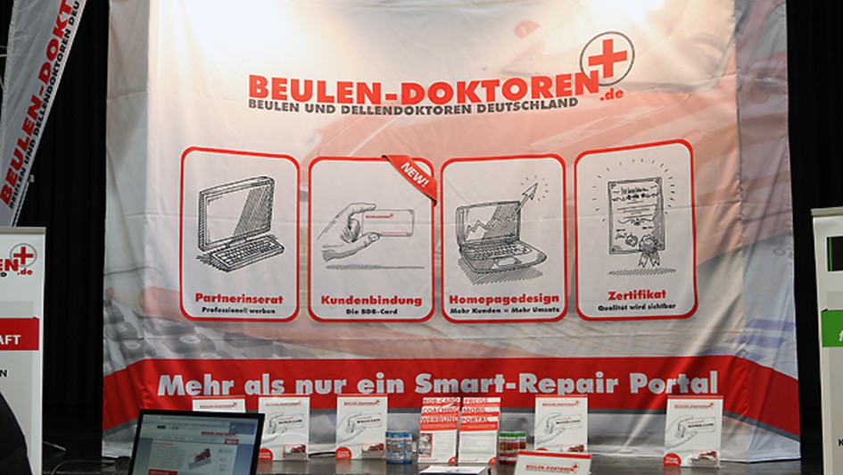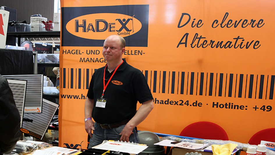 von 44: Rafael Takii mit Dr. Hammer vor dem Stand von Hamm Dellentechnik, die Equipment von DENT GEAR vertreiben. Diese Dellenprofis stellten 2015 gleich zwei der drei Gewinner der Dellenmeisterschaft
