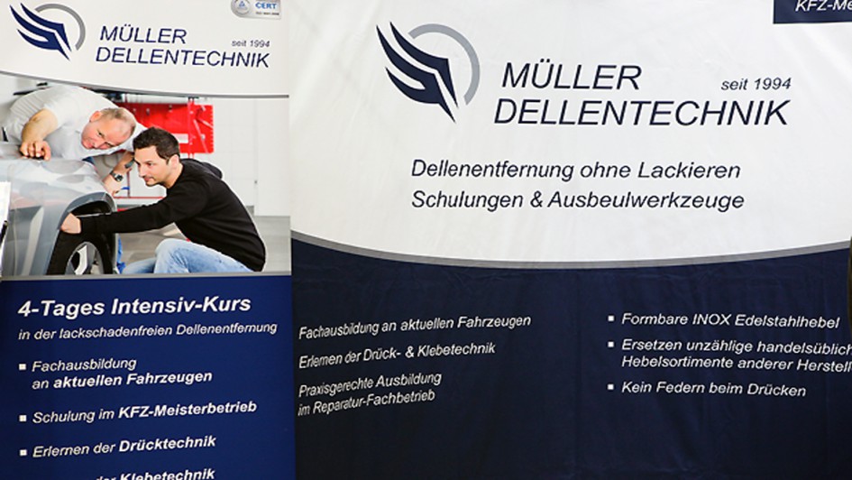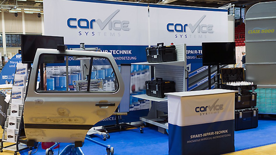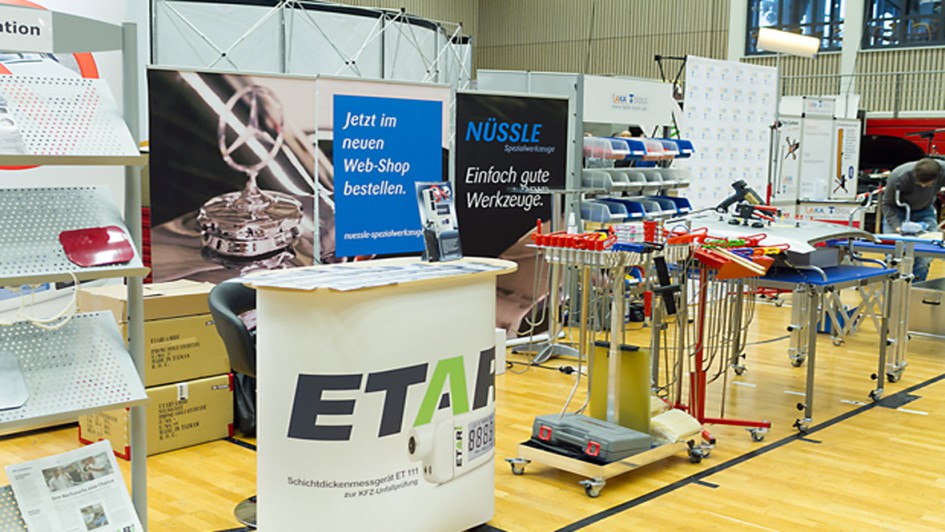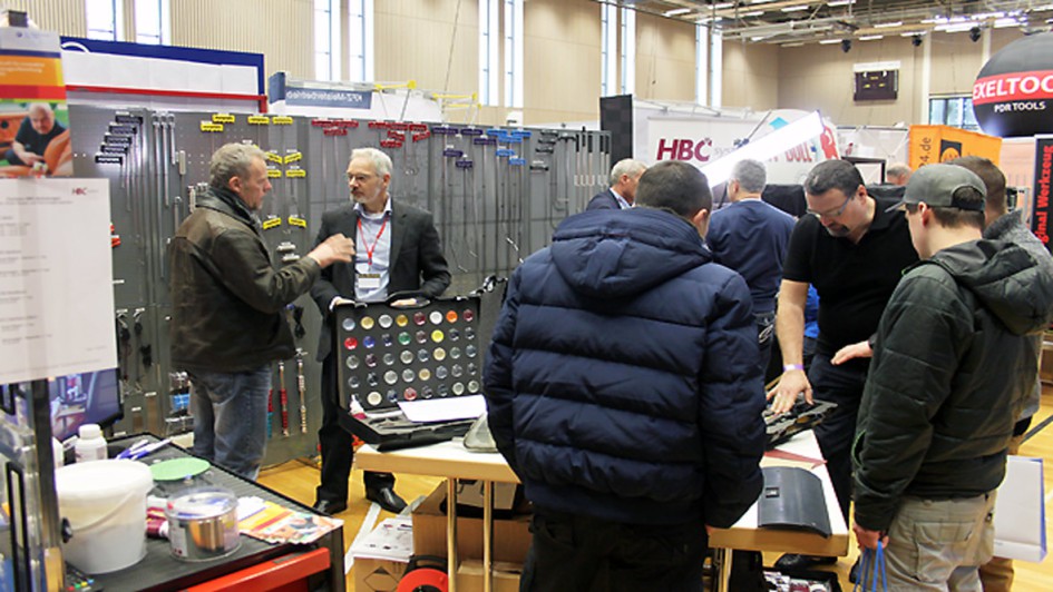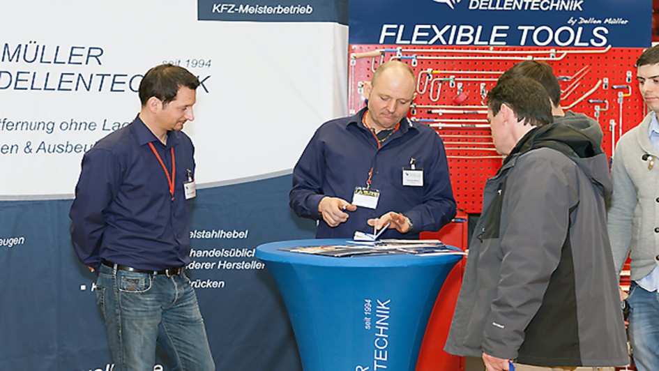 von 44: Thomas Martin (Vertrieb), Thomas Beck (Trainer lackschadenfreie Ausbeultechniken) sowie VL Siegbert Müller von Carbon präsentierten ihre Spezialwerkzeuge u. Hilfsmittel