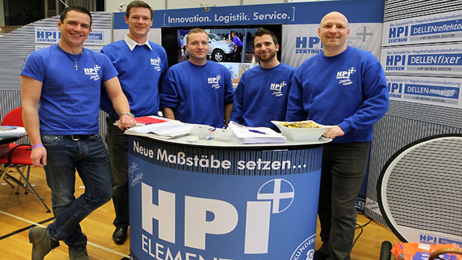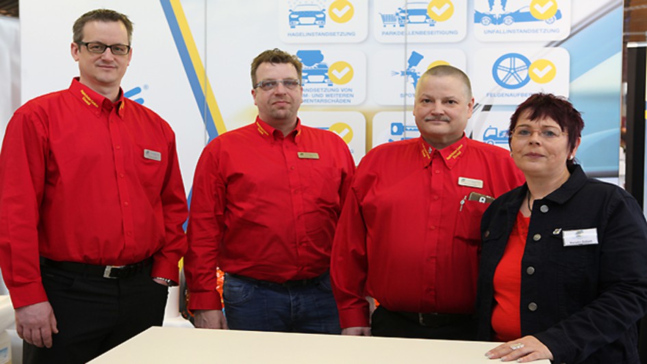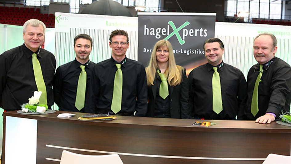 von 44: Die Schadens-Logistiker von HagelXperts: Andreas Kiefer (Felgenaufbereiter), Scott Delitzsch (Schadensmanager) GF Mike Roder, Sonja Schuster (Backoffice), Christoph Nitsche und Volker Schollmeier (Dellentechniker)