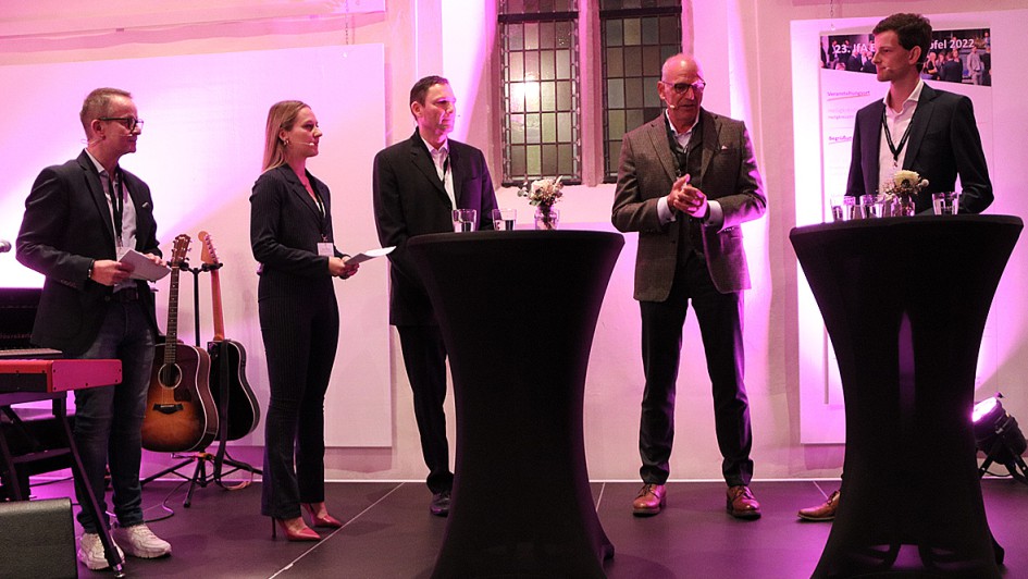 von 16: Talk bei der Vorabendveranstaltung in der Kreuzkirche Nürtingen (v.li.): Stefan Reindl (IfA), Kathrin Stangl (Moderatorin), Roman Still (AVAG), Jürgen Stackmann und Philipp Höveler (Moderator).