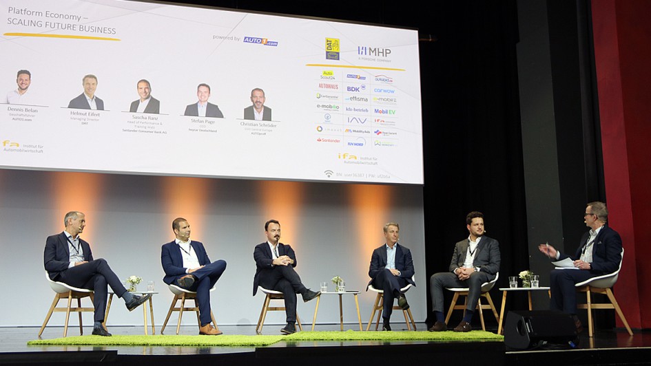 von 16: Plattform-Ökonomie (v.li.): Christian Schröder (Autoproff), Sascha Ranz (Wabi/Santander), Stefan Page (Heycar), Helmut Eifert (DAT) und Denis Belan (Auto1.com)