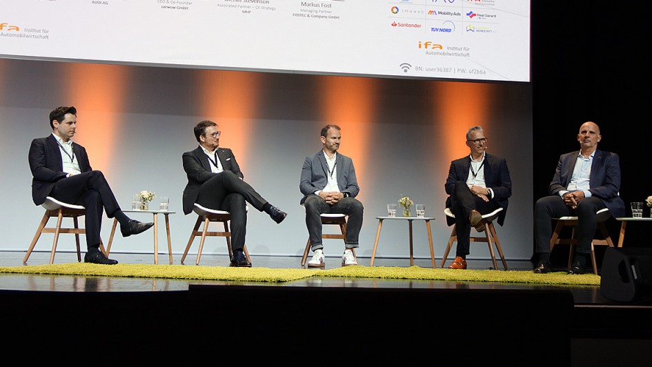 von 16: Im Sales Forum ging es um die Verkäufe der Zukunft (v.r.): Alexander Carsten Klose (Aiways), Philipp Noack (Audi), Philipp Sayler von Amende (Carwow), Merlin Stevenson (MHP) und Markus Fost (Fostec).