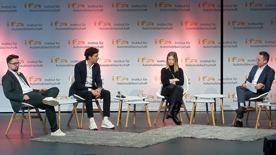 von 15: Die "jungen Wilden" traten im Retail Forum auf (v.l.n.r.): Johannes Marx (Jepsen Autogruppe), Florian Hofmann (Wittmann & Hofmann AG) und Karima Knigge (Woltmann GmbH) mit Moderator Prof. Benedikt Maier. Paul Rosier (Rosier Holding) wurde zugeschaltet.