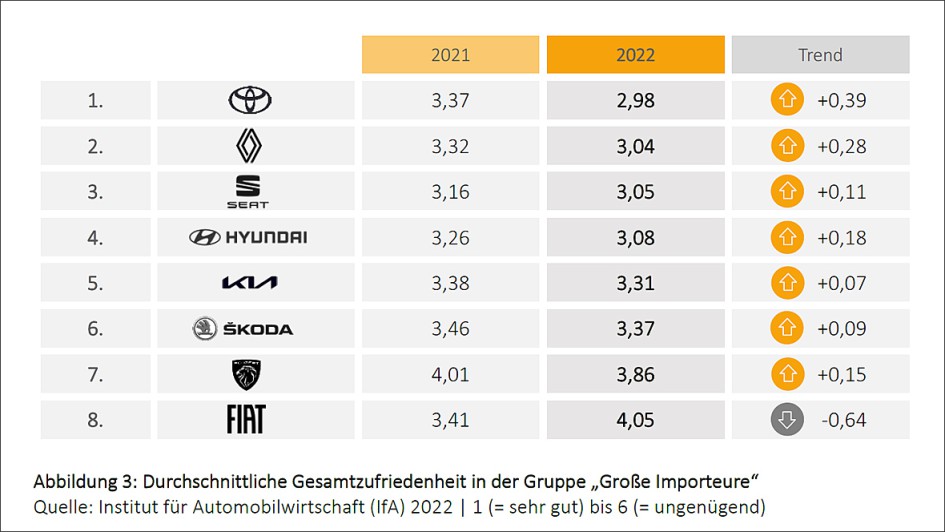 Im Vergleich zu den anderen vier Fabrikatsgruppen geht es an der Spitze der "Großen Importeure" verhältnismäßig eng zu. So liegen die Top-4-Marken nicht mehr als 0,10 Notenpunkte auseinander. Durchsetzen kann sich am Ende Toyota mit der Note 2,98. Dank der großen Zufriedenheitszugewinne (plus 0,39) ist Toyota auch die einzige Marke dieser Gruppe, bei deren Gesamtzufriedenheit eine Zwei vor dem Komma steht. Insgesamt dürfte sich die Stimmung der Handelspartner großer Importeure im Aufwind befinden. So verbessern sich die Durchschnittszufriedenheitswerte von insgesamt siebender acht analysierten Marken innerhalb der Gruppe. Einzig bei den Fiat-Betrieben ist die Zufriedenheit zum nunmehr dritten Mal in Folge im Sinkflug.