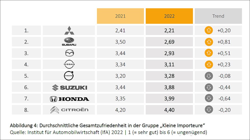 Die Gruppe der "Kleinen Importeure" zeigt sich mit einer bunten Mischung aus Auf- und Absteigern bei gleichzeitig konstantem Gruppensieger und Schlusslicht. So sind es zum nunmehr dritten Mal in Folge die Mitsubishi-Partner, die ihre Marke am besten bewerten. Dabei liegt die durchschnittliche Gesamtzufriedenheit nur um 0,01 Notenpunkte unter der Zufriedenheit der Porsche-Partner. Den größten Sprung nach vorne macht jedoch Subaru, dessen Händlerzufriedenheit sich achtbar verbessert und von 3,50 im Vorjahr auf aktuell 2,69 klettert. Das Schlusslicht bildet abermals Citroën, bei denen die Beziehungssituation zunehmend in den mangelhaften Bereich abdriftet.