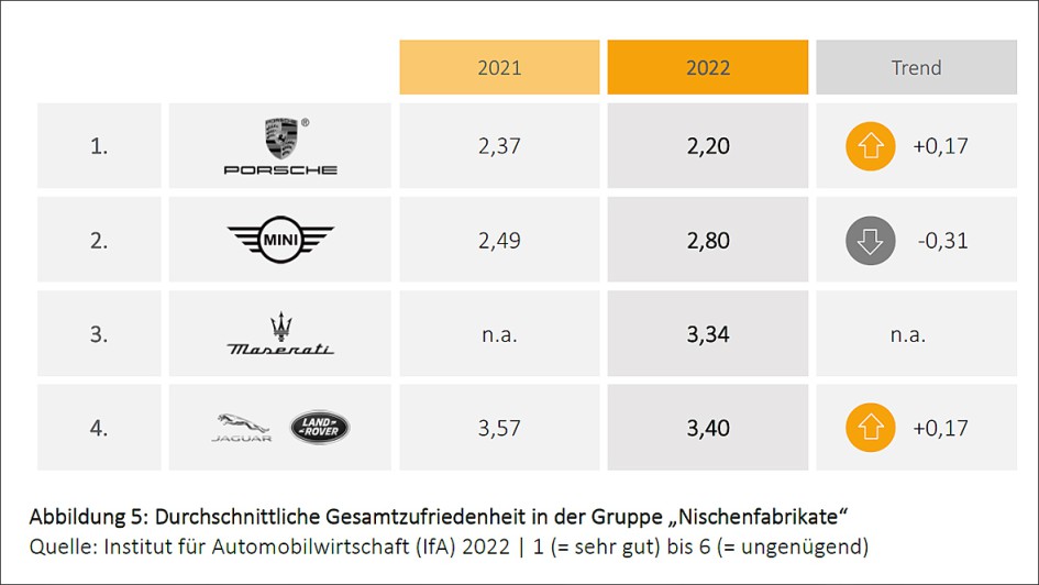 In der Gruppe der "Nischenspezialisten" gelingt es Porsche erneut, den Gruppensieg (Note 2,20) zu erringen. Die beste Note vergeben die Porsche-Händler traditionell im Feld "Produkt und Marke" (1,63). Schwachstelle bildet hingegen das Feld "Aftersales" (2,51). Im Gegensatz zum Vorjahr, in dem Mini dem Zuffenhausener Sportwagenhersteller dicht auf den Fersen war (Abstand 0,12 Notenpunkte), ist das Stimmungsbild in diesem Jahr eindeutig. Die BMW-Tochter hat auf allen Ebenen mit starken Zufriedenheitsverlusten zu kämpfen. Erstmalig erfasst der IfA MarkenMonitor in diesem Jahr die Händlerzufriedenheit bei Maserati, die sich gleich bei ihrem Debüt auf den dritten Rang vor Jaguar Land Rover schieben.
