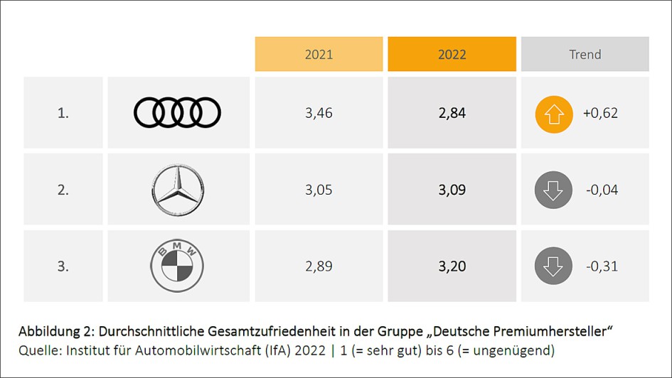 Nachdem Audi in den vergangenen beiden Erhebungswellen jeweils abgeschlagen den letzten Platz bei den "Deutschen Premiumherstellern" einnehmen musste, machen die Ingolstädter in diesem Jahr einen großen Sprung und setzen sich an die Gruppenspitze. Während die Händlerzufriedenheit bei Mercedes nahezu stagniert (minus 0,04) und die Stimmung der BMW-Händlerschaft einen herben Dämpfer verzeichnet (minus 0,31), kann sich Audi über breite Zufriedenheitszuwächse (plus 0,62) freuen. So kann Audi in allen fünf Beziehungsfeldern zulegen. Die BMW-Händler sind vor allem mit der Vertriebs- und Netzpolitik sowie mit dem Gebrauchtwagengeschäft deutlich unzufriedener als 2021. Größter Kritikpunkt auf Ebene der Mercedes-Händler ist die Vertriebspolitik.
