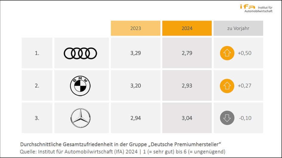 von 6: Deutsche Premiumhersteller – Audi stürmt an die Gruppenspitze: Die Entwicklungen in dieser Kategorie sind schon seit Jahren geprägt durch zahlreiche Positionsverschiebungen. So könnten auch 2024 die Zufriedenheitsentwicklungen bei den drei Marken unterschiedlicher nicht sein: Nachdem Mercedes-Benz noch im Vorjahr mit deutlichem Vorsprung den Gruppensieg für sich verbuchen konnte, geht es für die Stuttgarter im IfA Marken-Monitor 2024 zurück auf den letzten Platz. Mercedes muss dabei vor allem in den Bereichen "Produkt und Marke" sowie "Gebrauchtwagen" deutlich Federn lassen. Größter Kritikpunkt der Handelsbetriebe bleibt wie im Vorjahr die Vertriebspolitik. Die Gesamtzufriedenheit der BMW-Händler hingegen steigt auf einen Notenwert von 2,93. Auffällig ist der relativ große Zufriedenheitszuwachs im Beziehungsfeld "Gebrauchtwagen" (plus 0,41). Nach dem letzten Platz 2023 schafft es Audi dagegen zurück an die Spitze bei den deutschen Premiumherstellern. Dabei steigt die Händlerzufriedenheit 2024 in allen fünf Interaktionsfeldern an.