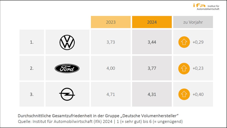 von 6: Deutsche Volumenherstellern – durchgängiger Aufwärtstrend: Innerhalb der Gruppe der deutschen Volumenhersteller steigen die Durchschnittswerte bei allen drei Marken an. Opel kann dabei am stärksten an Zuspruch aus der Handelsebene zulegen und steigert sich um 0,4 Notenpunkte. Weil auch VW und Ford in ähnlichen Größenordnungen zulegen, bleibt das Ranking unverändert. Die Abstände der Marken untereinander fallen dabei mit 0,33 (Volkswagen zu Ford) und 0,54 Notenpunkten sehr deutlich aus, sodass der Gruppensieg von Volkswagen angesichts der stabileren Ausgangsbasis und den stärkeren Zufriedenheitswerten in allen fünf Beziehungsfeldern nicht gefährdet war.
