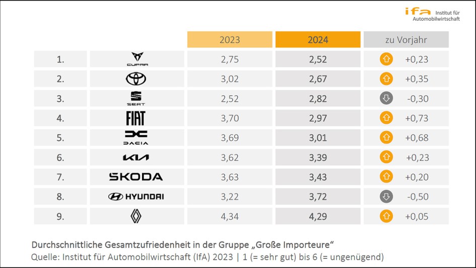 von 6: Großen Importeure – Cupra erstmals an der Spitze: Auch bei den Großen Importeuren kann der Gruppensieger eindeutig ausgemacht werden. Mit einem Vorsprung von 0,15 Notenpunkten auf den Zweitplatzierten Toyota gelingt es Cupra, sich 2024 an die Spitze zu setzen. Anzumerken ist an dieser Stelle, dass die spanische Marke aufgrund des zuletzt deutlich gestiegenen Marktanteils in diesem Jahr erstmalig in dieser Gruppe geführt wird. Dabei kann sich Cupra nach der MarkenMonitor-Premiere im Vorjahr in allen fünf Interaktionsfeldern steigern. Am besten bewerten die Händler den Bereich "Produkt und Marke" (2,22). Die größten Zufriedenheitszuwächse sind in der Vertriebspolitik (plus 0,43) und im Gebrauchtwagengeschäft (plus 0,37) zu verzeichnen. Auffällig in der Gruppe der großen Importeure ist, dass sieben der insgesamt neun Marken die Händlerzufriedenheiten steigern können. Dabei machen Fiat (plus 0,73) und Dacia (plus 0,68) den größten Sprung nach vorne. Bei Seat und Hyundai hingegen geht die Händlerzufriedenheit zurück. Renault kann seine Händlerzufriedenheit nur marginal (plus 0,05) steigern und bleibt nach wie vor Schlusslicht. Erwähnt sei an dieser Stelle das deutlich bessere Abschneiden der Schwestermarke Dacia (3,01). Auffallend ist auch die vergleichsweise schwache Performance der koreanischen Importeure Hyundai und Kia. Hyundai muss dabei einen deutlichen Zufriedenheitsrückgang von 0,50 Notenpunkten verkraften.
