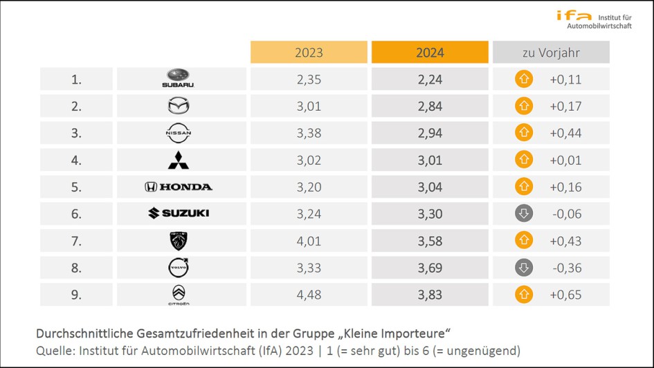 von 6: Kleine Importeure – Subaru mit erfolgreicher Titelverteidigung: Nachdem sich Mitsubishi in den Jahren 2020, 2021 und 2022 dreimal in Folge über die größten Händlerzufriedenheiten bei den kleinen Importeuren freuen konnte, entwickelt sich Subaru zum neuen Seriensieger. Mit der Note 2,24 und einer Steigerung um 0,11 Notenpunkte schaffen die Japaner es erneut an die Gruppenspitze. Dabei zeigen sich die Subaru-Händler in allen fünf beziehungsrelevanten Feldern zufriedener als im Vorjahr. Am stärksten honorieren die Händler die Zusammenarbeit mit dem Außendienst (Note 1,20) sowie die Fahrzeugqualität (Note 1,24). Größter Kritikpunkt der Subaru-Händler ist die Attraktivität der Finanzdienstleistungsangebote der Herstellerbank (Note 3,12). Komplettiert wird das Podium durch Mazda und Nissan. Dabei kann vor allem Nissan einen starken Zufriedenheitszuwachs verbuchen (plus 0,44) und rückt vom achten Rang auf den dritten Platz im Gruppenranking vor.