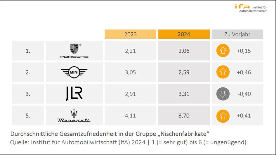 von 6: Nischenspezialisten – Porsche triumphiert erneut: In dieser Kategorie zeigt sich Porsche einmal mehr als stabile Größe. Mit einer satten Zufriedenheitssteigerung um 0,15 Notenpunkte etabliert sich der Zuffenhausener Sportwagenhersteller erneut unangefochten auf dem ersten Platz. Während das Markenimage bei Porsche mit Abstand am besten bewertet wird (Note 1,07), ist der größte Schwachpunkt die Gebrauchtwagen-Beschaffungsplattform (Note 3,24). Es fällt allerdings ins Auge, dass Porsche über alle Marken hinweg nur in drei der fünf Beziehungsfelder die zufriedensten Händler vorweisen kann. In den Beziehungsfeldern Netzpolitik und allgemeine Zusammenarbeit als auch im Bereich Gebrauchtwagen sind die Subaru-Autohäuser zufriedener als die Porsche-Partner. Auf Platz zwei bei den Nischenspezialisten reiht sich Mini ein. Mit einer satten Zufriedenheitssteigerung um 0,46 Notenpunkte reicht es zwar nicht an Branchenprimus Porsche heranzukommen. Dennoch sind die Mini-Händler deutlich zufriedener als ihre Kollegen von JLR und Maserati.