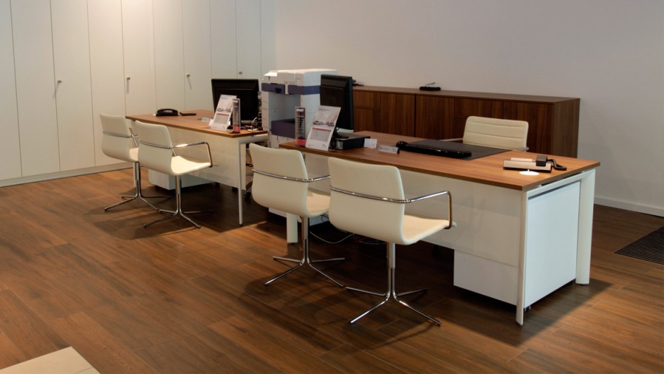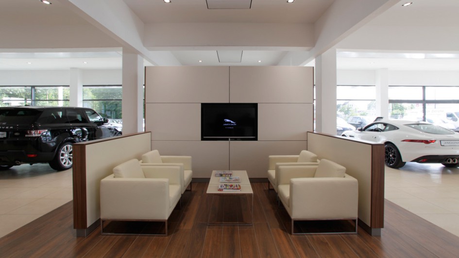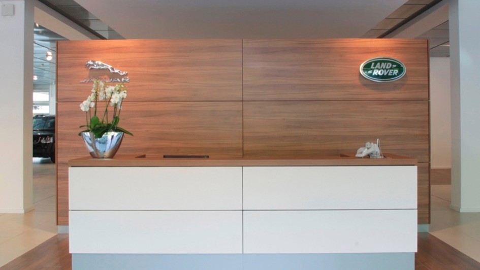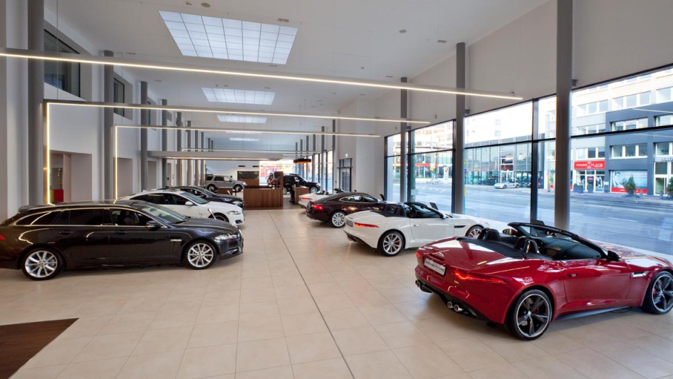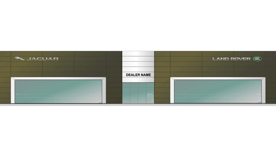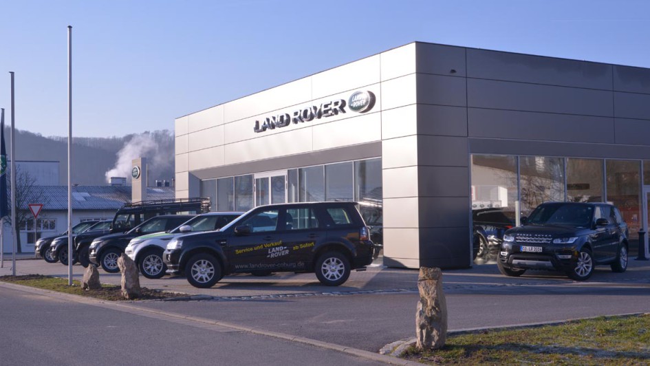 von 7: Die Fassadenfarbe ist typisch britisch "Sunshine Grey Metallic" – also Sonnenschein Grau Metallic. Trichterförmig geneigte Bleche sollen die Blicke der Kunden in die Ausstellung leiten.