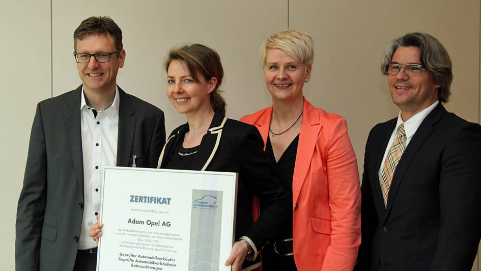 von 10: Opel startete ebenfalls mit der Ausbildung zum Gebrauchtwagenverkäufer. Für den Hersteller nahm Anja Freitag (2. v. l.) die Zertifizierungsurkunde entgegen.