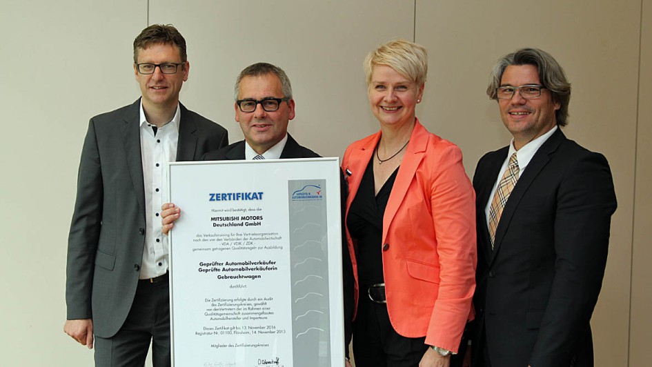 von 10: Auch Mitsubishi fokussierte sich 2013 auf die Ausbildung der Gebrauchtwagenverkäufer. Die GAV-Geschäftsführer überreichten Peter Schieder (2. v. l.) die Urkunde.