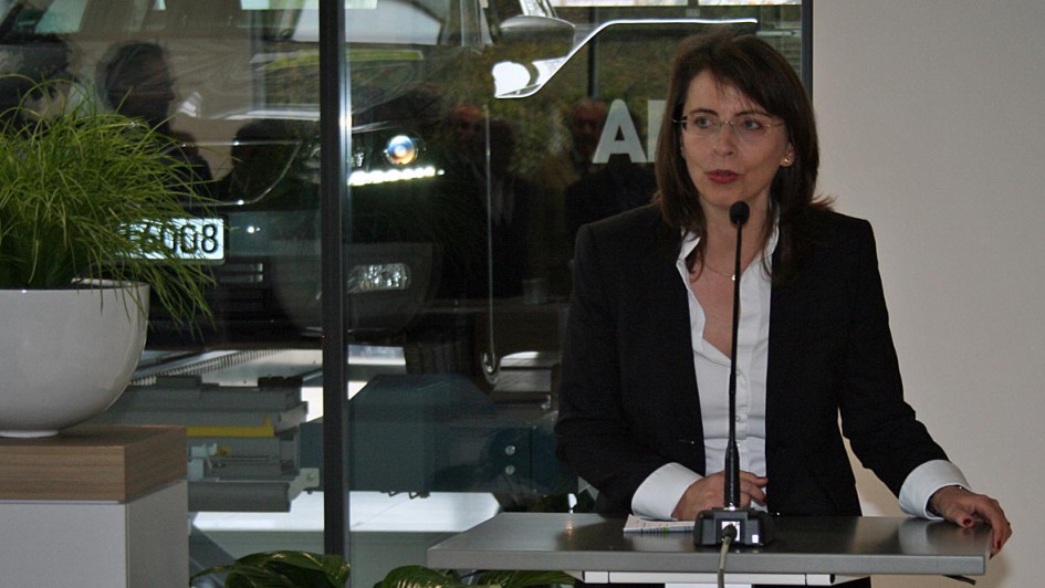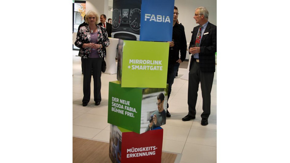 von 10: Imelda Labbé (r.) überreichte assistiert von Gebietsleiter Kolja Eger (M.) das Geschenk von Skoda Auto Deutschland zur Eröffnung an Christian Hackerott (l.).