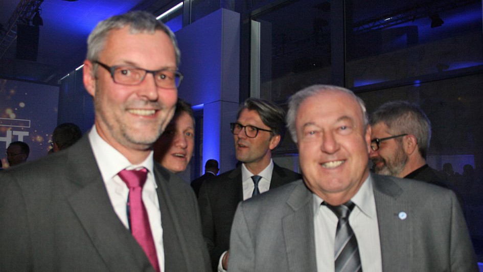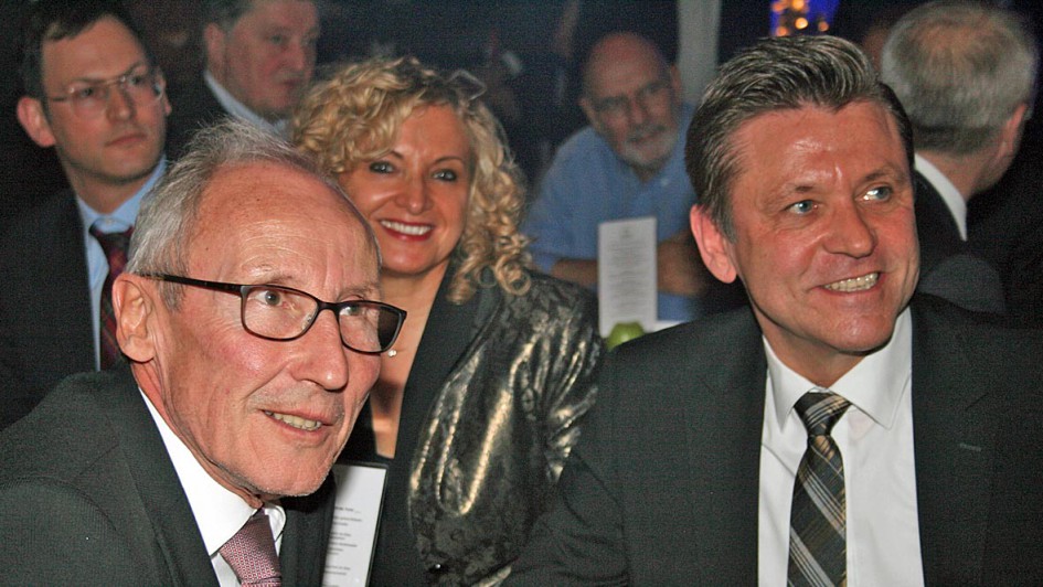 von 12: Ehrengäste v.l.: Mark Karpinski, Klaus Dieter Breitschwert, Hildegard und Adolf Volpert, Jürgen Karpinski, Helga Vedder und Wilhelm Hülsdonk.