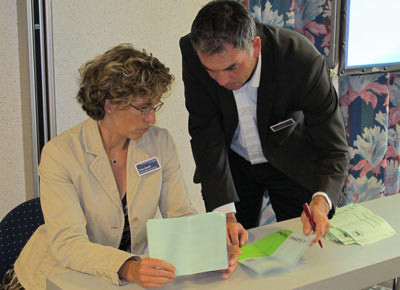 von 11: Landesverbandsgeschäftsführer Dirk Weinzierl leitete die Neuwahlen. Petra Brandl, Geschäftsführerin der Kfz-Innung Augsburg und aktiv in der Vorstandschaft des BFC in Calw, assistiert bei der Stimmenauszählung.