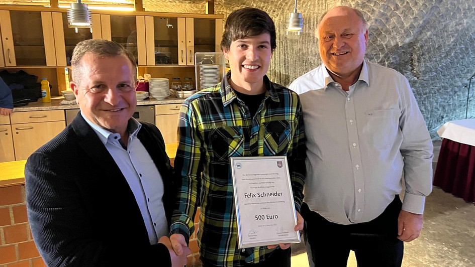 von 5: Der deutsche Meister der Kfz-Mechatroniker, Felix Schneider, stammt aus dem Autohaus Schade in Eisennach. Thomas Peckruhn honorierte die Leistung mit einer Urkunde und 500 Euro.